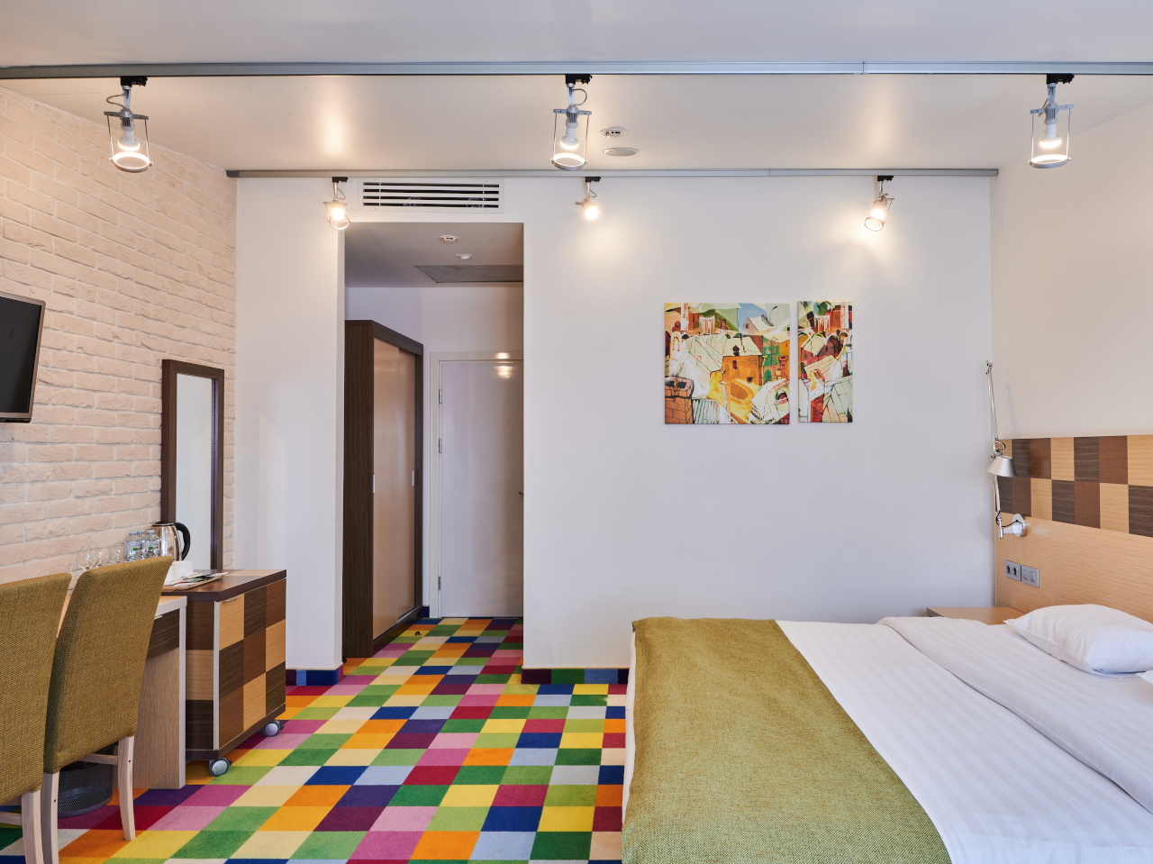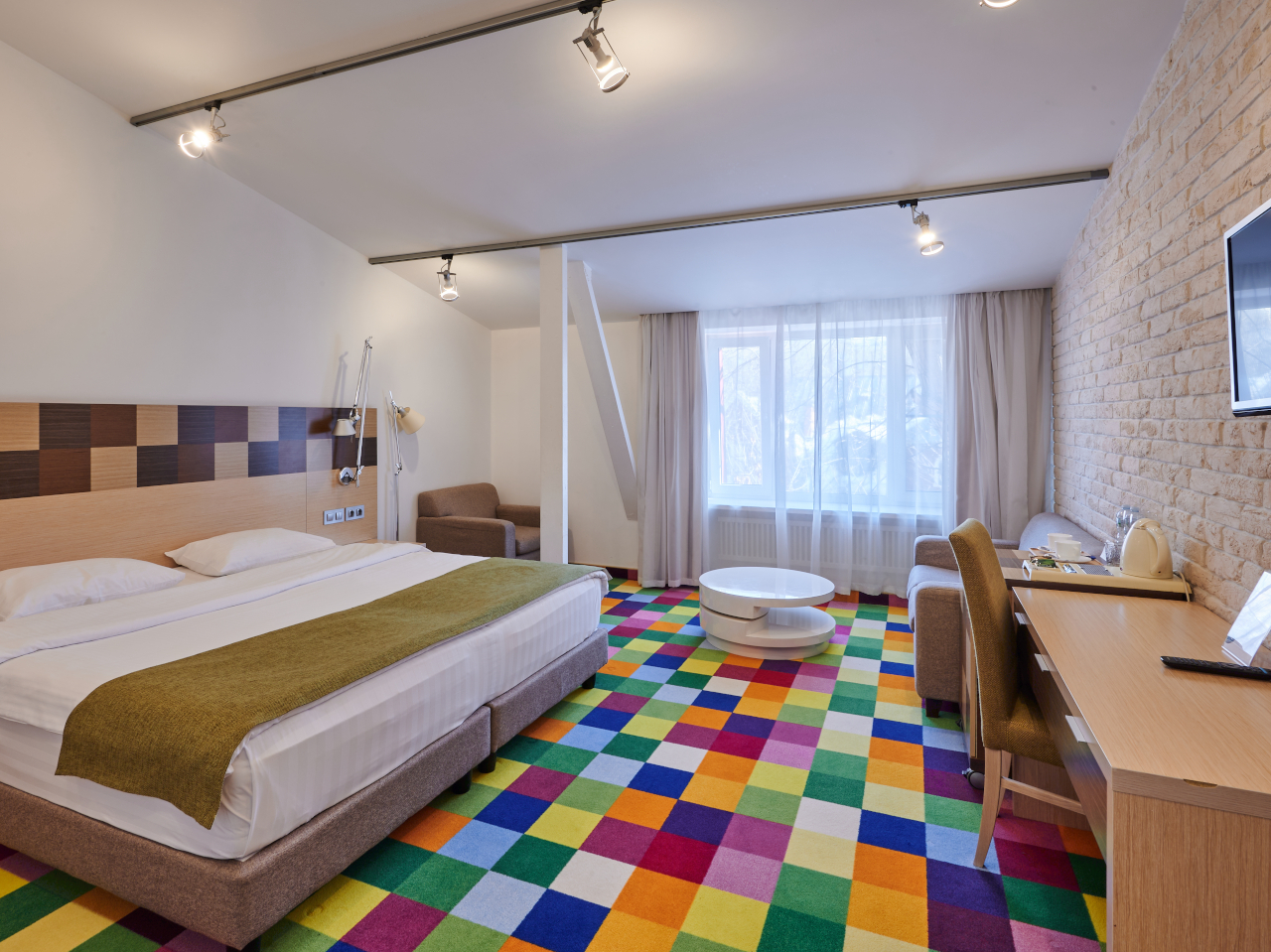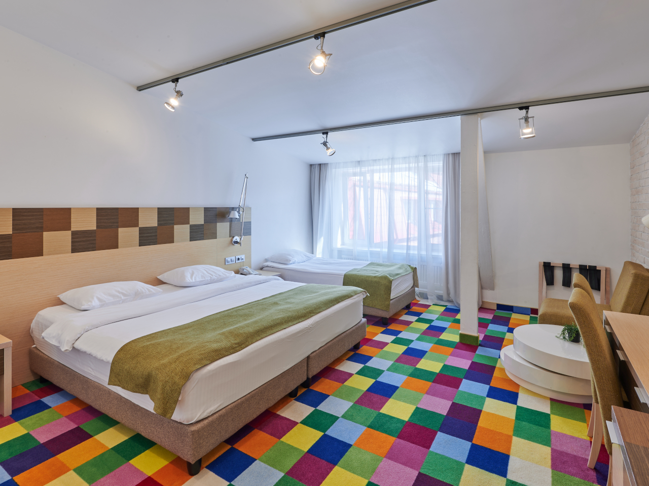 Просторный номер площадью от 30 кв.м. с двумя односпальными кроватями 90*200 или одной 180x200 двуспальной кроватью на Ваш выбор. Плюс дополнительное спальное место: полноценная кровать или раскладной диван.Комфортное размещение для троих взрослых или для семьи с детьми. Кроме кроватей в номере находятся рабочий стол, стул, шкаф, 2 тумбы, светильник, зеркало в полный рост, кресло,журнальный столик, вешалка с крючками для верхней одежды. Во всех номерах стоит обратить внимание на светлую ванную комнату со стеклянной душевой кабиной, оснащенной гелем для душа, шампунем, лосьоном, кондиционером для волос, мылом, косметическим, бритвенным, и зубным наборами. В каждом номере есть фен, холодильник, телефон, телевизор, кондиционер, сейф, утюг, гладильная доска, чайник, черный и зеленый чай, кофе растворимый, сахар, чашки, стаканы, ложки, бутилированная вода, тапочки, халаты, швейный набор, шапочка для душа. В каждом номере работает wi-fi. По запросу: беруши, расческа.