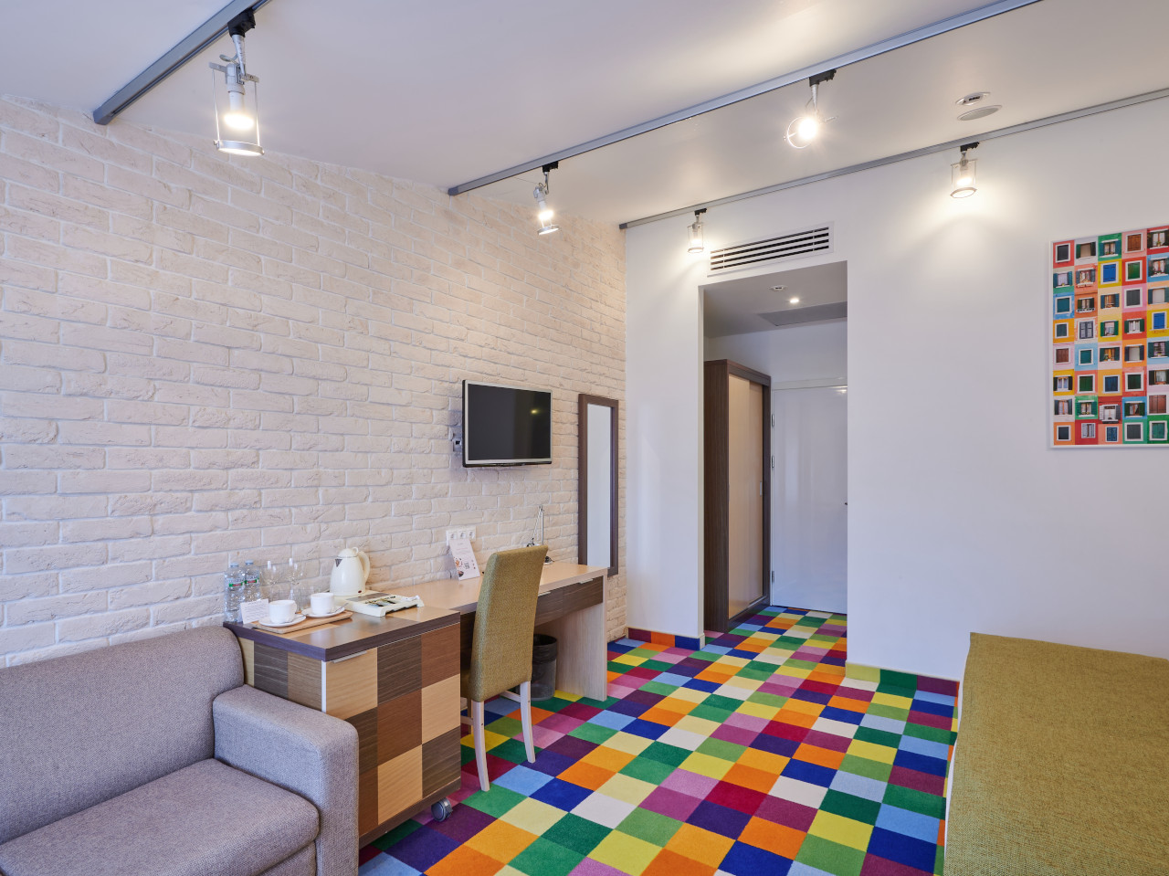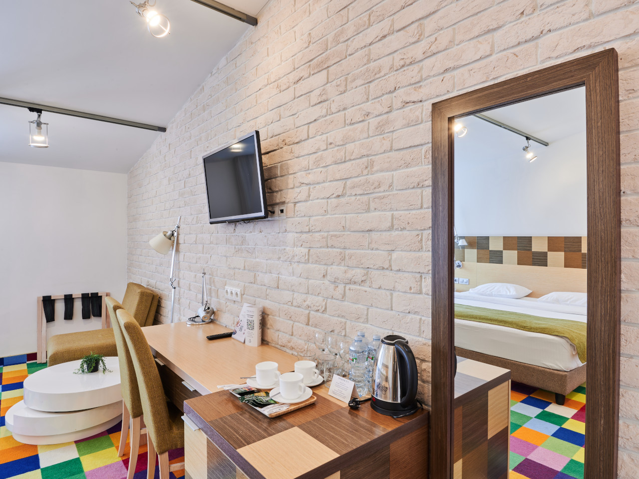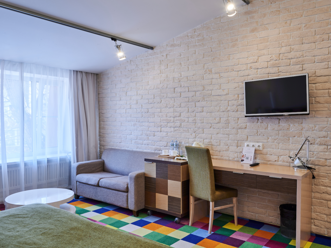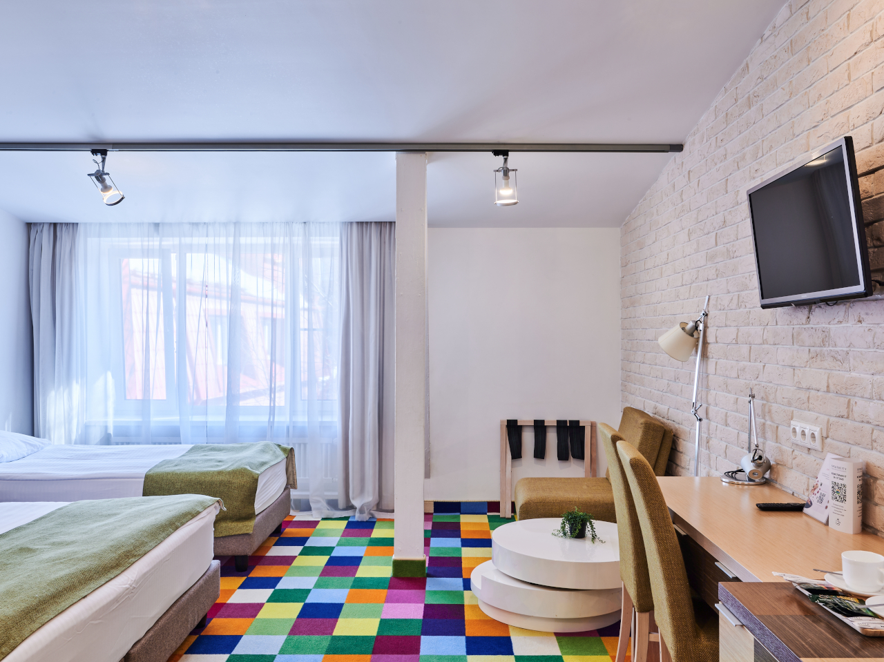 Просторный номер площадью от 30 кв.м. с двумя односпальными кроватями 90*200 или одной 180x200 двуспальной кроватью на Ваш выбор. Плюс дополнительное спальное место: полноценная кровать или раскладной диван.Комфортное размещение для троих взрослых или для семьи с детьми. Кроме кроватей в номере находятся рабочий стол, стул, шкаф, 2 тумбы, светильник, зеркало в полный рост, кресло,журнальный столик, вешалка с крючками для верхней одежды. Во всех номерах стоит обратить внимание на светлую ванную комнату со стеклянной душевой кабиной, оснащенной гелем для душа, шампунем, лосьоном, кондиционером для волос, мылом, косметическим, бритвенным, и зубным наборами. В каждом номере есть фен, холодильник, телефон, телевизор, кондиционер, сейф, утюг, гладильная доска, чайник, черный и зеленый чай, кофе растворимый, сахар, чашки, стаканы, ложки, бутилированная вода, тапочки, халаты, швейный набор, шапочка для душа. В каждом номере работает wi-fi. По запросу: беруши, расческа.
