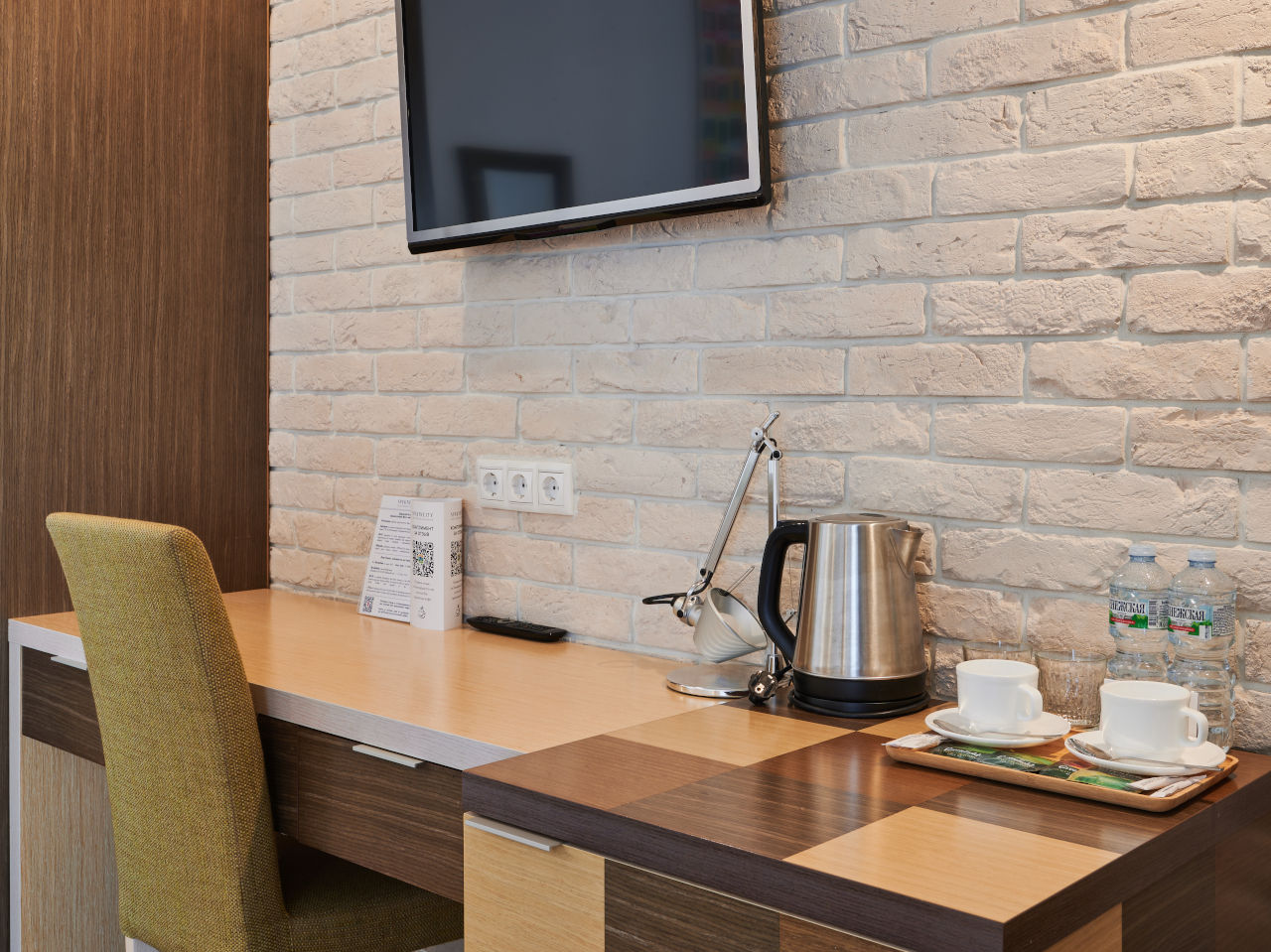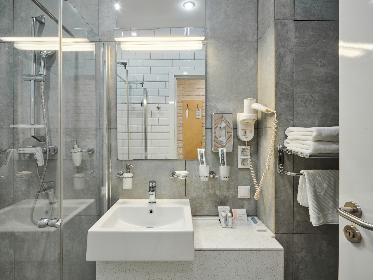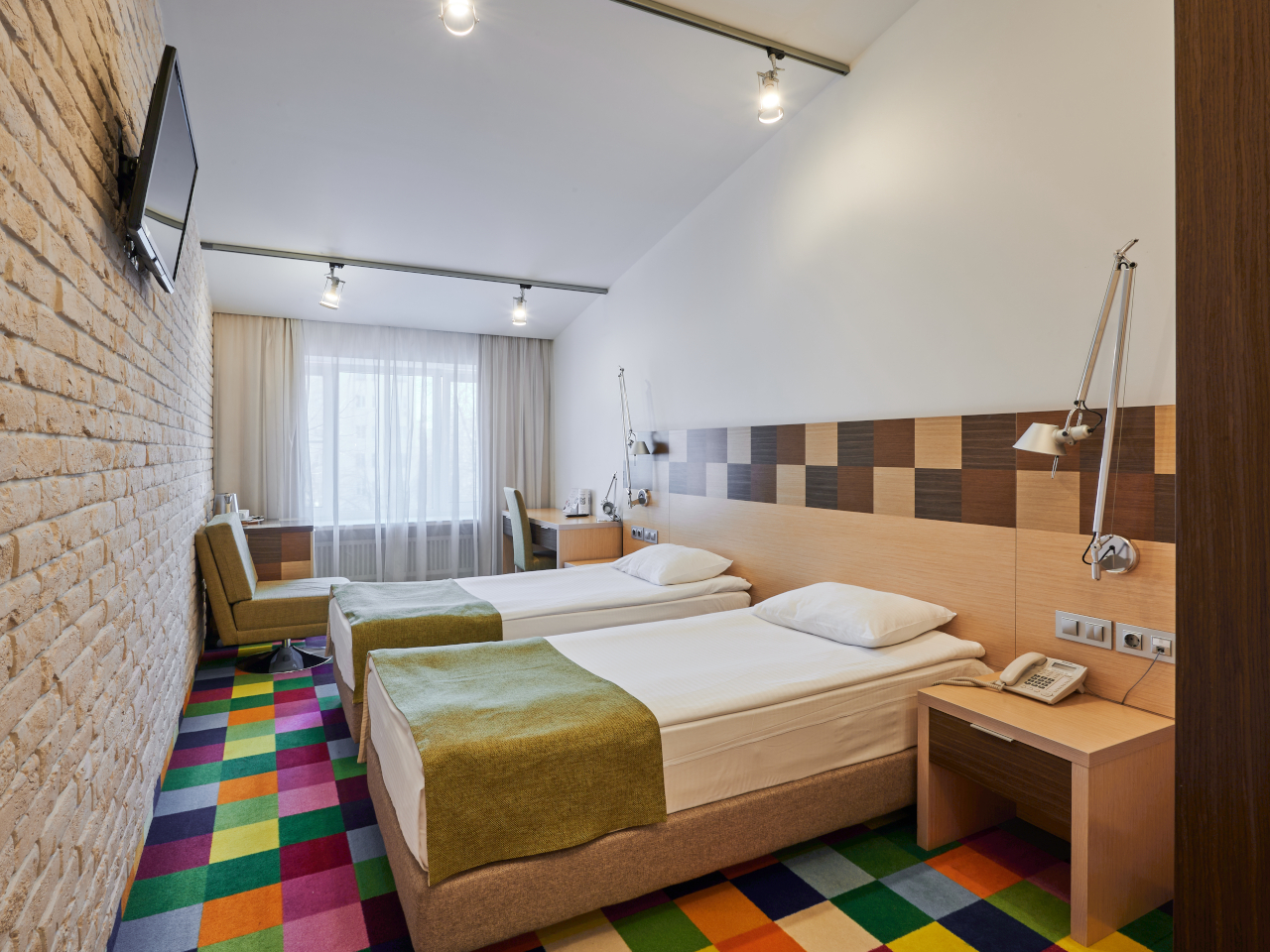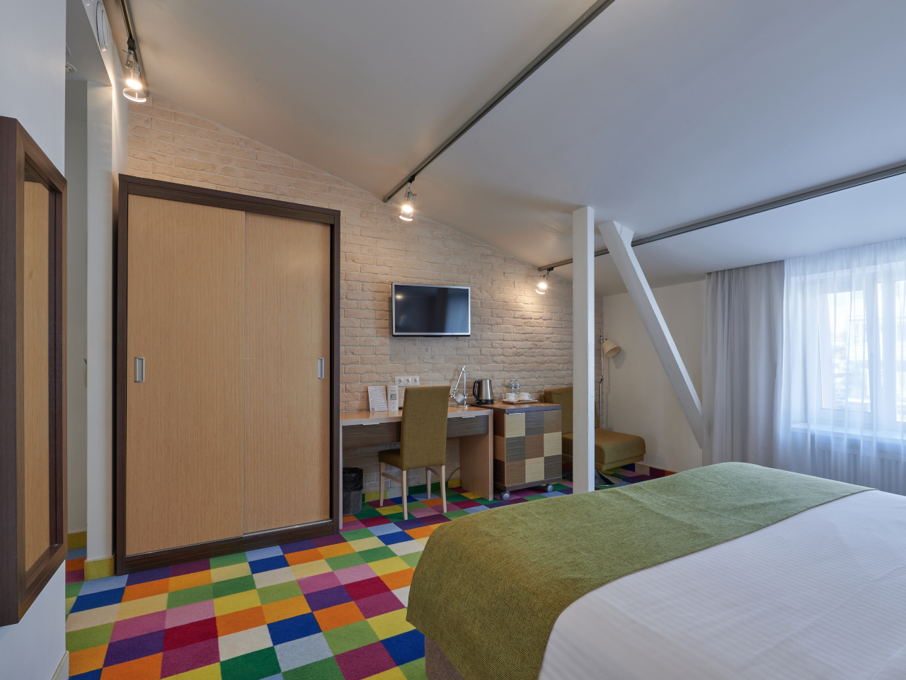 Классический номер площадью 24 кв. м. В номере одна двуспальная 180*200 или две односпальные кровати 90*200 ( по запросу гостя), 2 прикроватные тумбочки, кресло, рабочий стол, стул, шкаф, светильник, зеркало в полный рост, вешалка с крючками для верхней одежды и светлая ванная комната со стеклянной душевой кабиной, оснащенной гелем для душа, шампунем, лосьоном, кондиционером для волос, мылом и зубным набором. Номер удобен для размещения одного или двух человек. Номер оборудован феном, телевизором, кондиционером, сейфом, холодильником, телефоном, утюгом, гладильной доской, чайником с набором черного и зеленого чая, кофе и сахара, чашками, стаканами и ложками, бутилированной водой, тапочками и салфеткой для обуви. В каждом номере есть wi-fi. По запросу: беруши, расческа, шапочка для душа, косметический, бритвенный и швейный наборы.